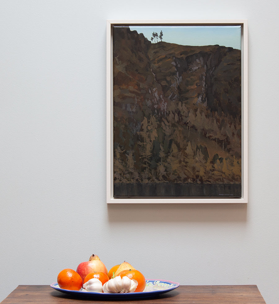 This piece was painted on location (plein air) at the upper lake in Glendalough. As you skirt the edge of the upper lake you look across at the valley wall which is the track of the famous Spinc walk. I'm really fascinated by painting these cliff walls, they are a challenge to do in winter as there is little to no sunlight that will hit this side of the valley no matter what time of day. Its a beautiful area of the Glendalough upper lake with the winter trees giving it a ghostly feel. The voices of walkers travel from the cliff crests down over the the lake to you as well as calls of deer, goats and birds of prey. Special place to paint and will be certainly returning again here.